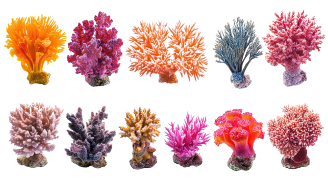 Vibrant coral reef ecosystem with various coral species and marine life underwater isolated on a white background.