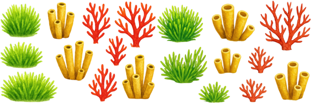 Colorful underwater corals and sea plants in vibrant shades of red, green, and yellow.