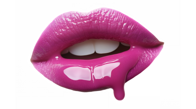 Glossy pink lips, high-contrast lighting, white teeth, biting gesture, saliva drip, sensual, macro photography, beauty advertisement style, vibrant magenta color, hyper-realistic, sharp detail