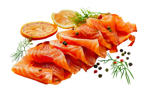 Smoked salmon slices with dill and citrus, cut out - stock png.