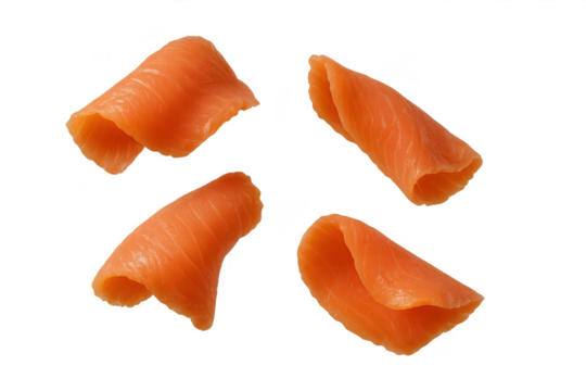Delicious salmon slices on a transparent background, raw fish fillet cut out