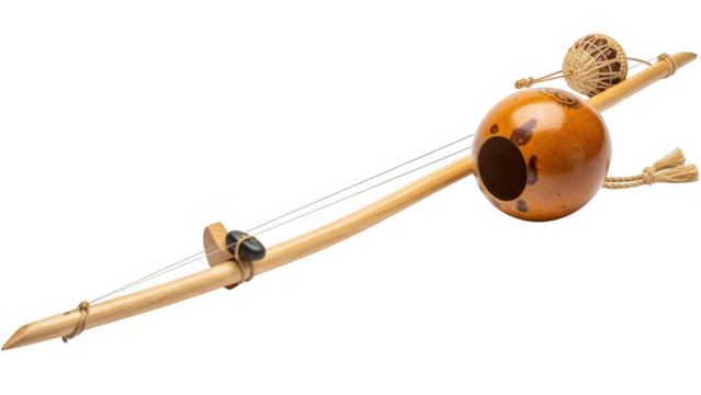 Coconut maraca musical instrument with wooden handle isolated on transparent background for creating rhythm and sound in latin american music