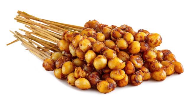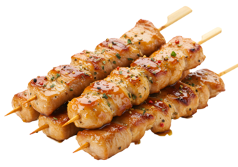 Grilled chicken satay skewers with peanut sauce, isolated on transparent background, realistic lighting