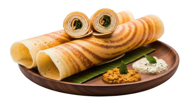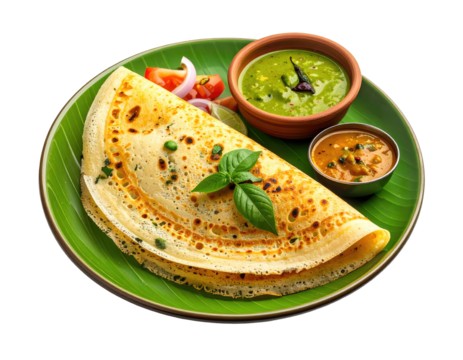 Crispy dosa with coconut chutney and tomato chutney isolated on transparent background dosa is a south indian crepe made from fermented batter it is a popular street food in india and is often served