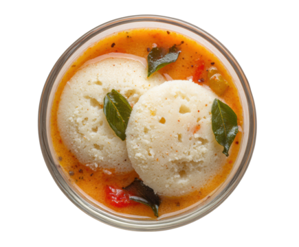 Creamy idli served in flavorful sambar with fresh herbs for lunch