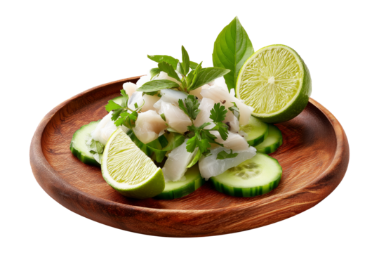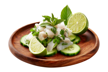 Ika Mata raw fish salad from the Cook Islands with seafood, lime, cucumber, and coconut in a wooden bowl, isolated on white transparent background, concept of Polynesian Cuisine