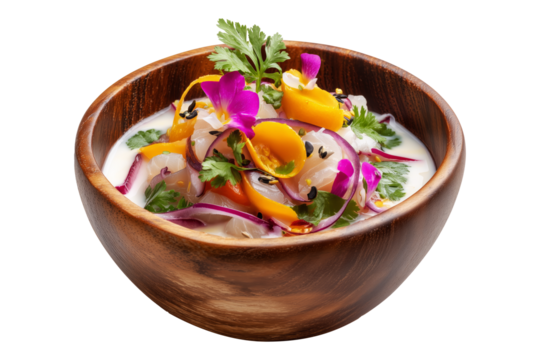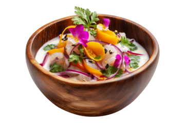 Oka Ia ceviche with raw fish, herbs, onions, and chili served in wooden bowl isolated on white transparent background, concept of traditional Polynesian cuisine
