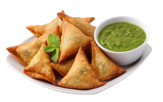 A plate of fresh Indian samosas served with a side of mint chutney and flavorful spices Isolated on transparent background PNG