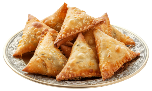 Crispy fried samosas served on white plate with transparent background