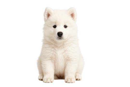A fluffy white samoyed puppy with a happy expression and its tongue slightly out sitting and looking forward isolated on transparent background
