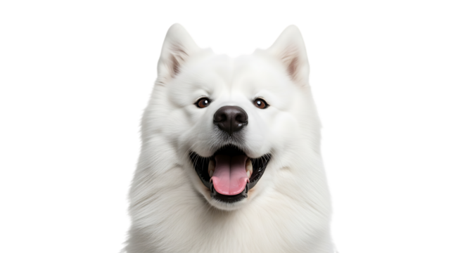 Closeup of a happy samoyed dog isolated on transparent background, smiling at camera
