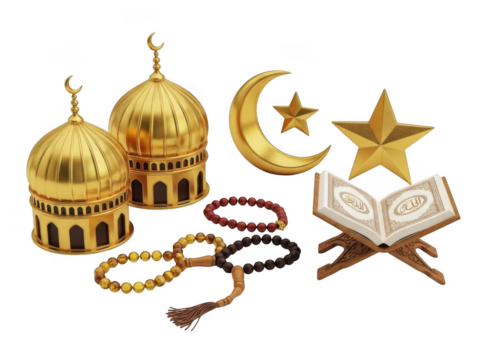 Golden islamic symbols and holy book isolated on transparent background
