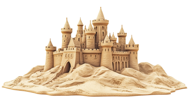 Elaborate sandcastle fortress with towers and walls isolated on transparent background