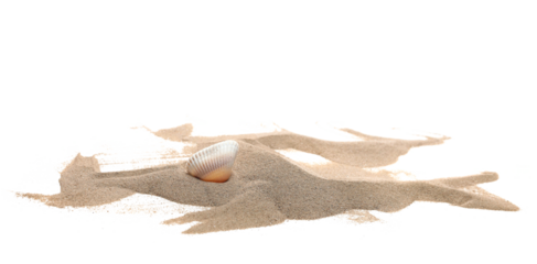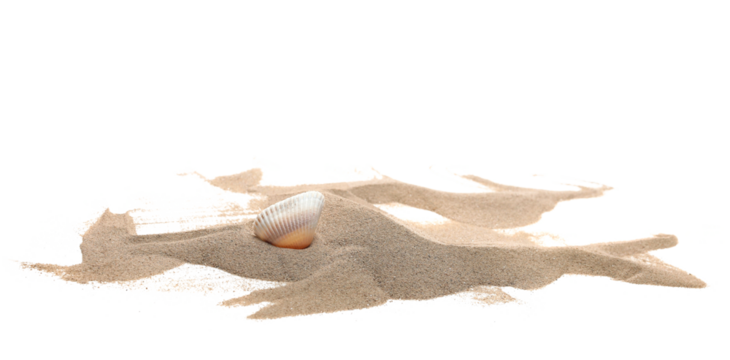 Seashell in sand pile isolated on white background