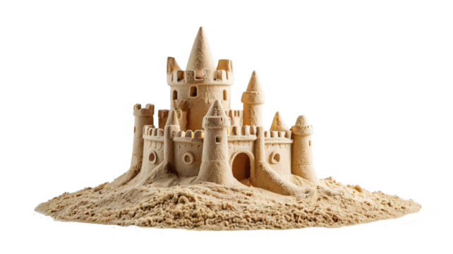 Photograph of Detailed Sandcastle with Two Towers, Arched Gate, Moat, and Red Flags – Isolated PNG