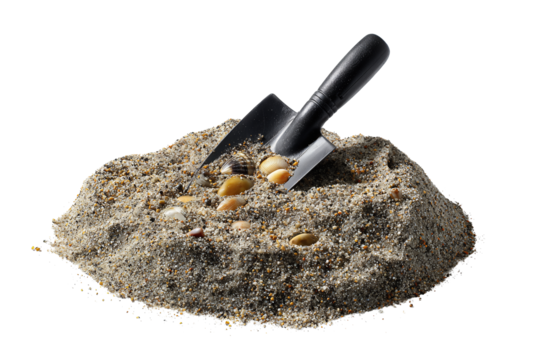 Small sandbox mound of damp sand with a half-buried black-handled trowel, isolated on transparent background.