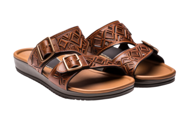 Stylish brown leather slide sandals for men and women featuring a comfortable footbed and durable sole isolated on transparent background isolated on white background