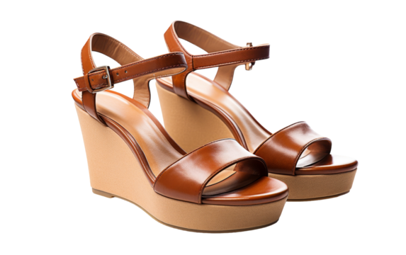 A pair of womens wedged sandals rest gracefully on a pristine white background