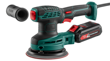 Cordless random orbital sander with dust collector attachment for efficient woodworking projects isolated on transparent background