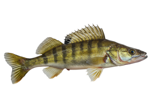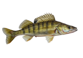 A vibrant zander fish (sander lucioperca) with olive-brown scales and dark vertical stripes, erect spiny dorsal fins, against a sterile transparent studio background. Clinical perfection photograph