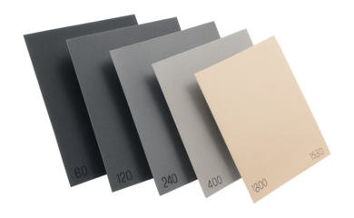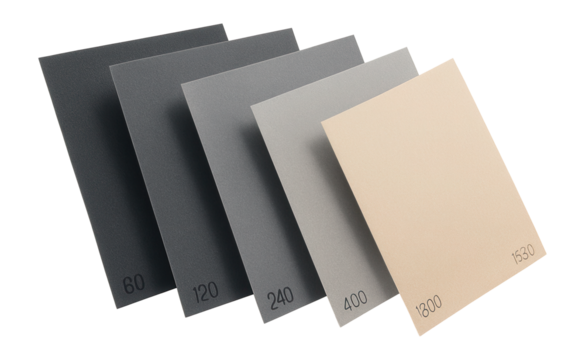 A close up shot showing an assortment of sandpaper sheets in varying colors and grit levels neatly stacked