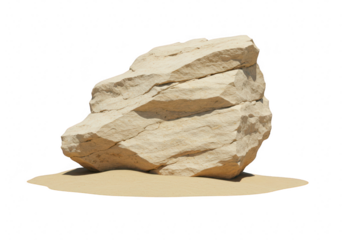 A rough, weathered sandstone rock isolated on transparent background, resting on a bed of fine sand