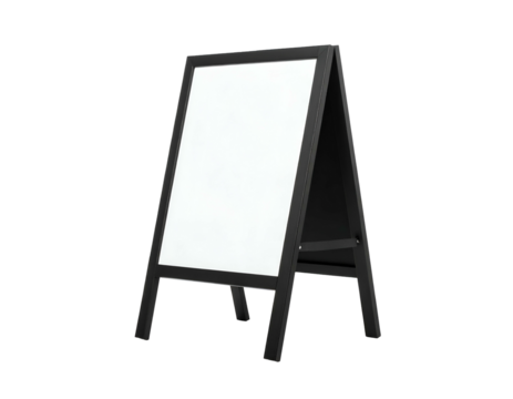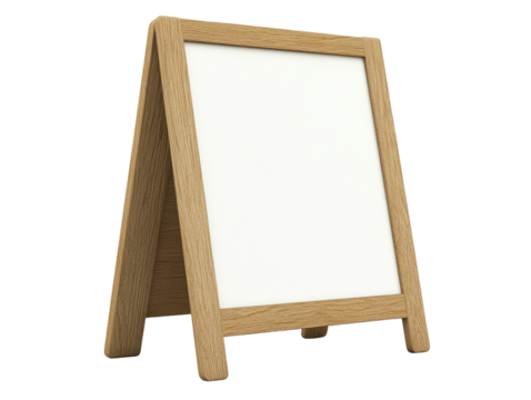 Blank chalkboard sandwich board with a wooden frame standing upright, ready for custom text or artwork. Transparent background