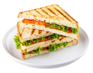 Grilled sandwich with tomato, lettuce, and cheese on a white plate against isolated on a transparent background