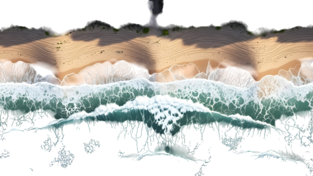 Ocean waves crashing on sandy beach shore isolated on a transparent background