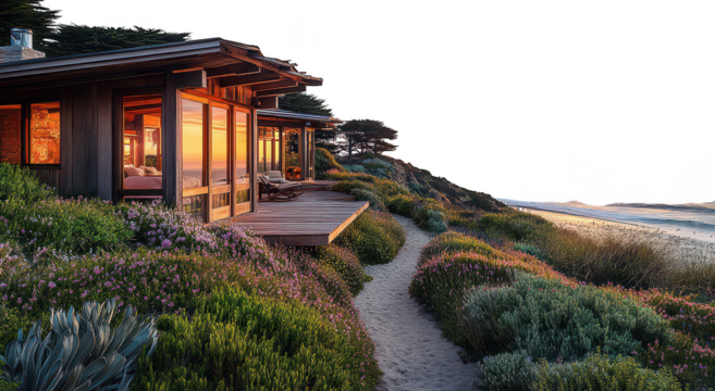 A serene coastal retreat a modern wooden house with expansive glass windows overlooking a sunset. surrounded by lush flowers and a sandy path leading to the ocean
