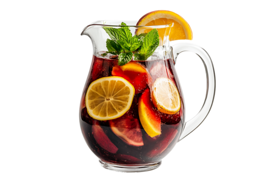 Isolated pitcher of sangria filled with colorful fruit, refreshing, celebratory beverage