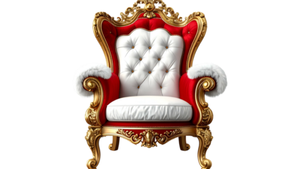 A regal red and gold chair with white cushions, likely for a festive figure, isolated