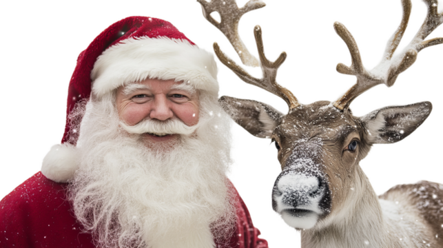 Joyful santa claus holding a festive red gift box with a ribbon isolated on transparent background