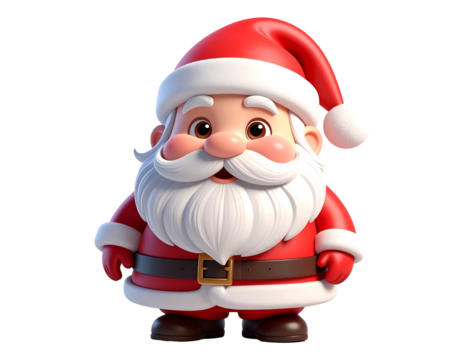 A cute, cartoonish Santa Claus stands with a bright red suit, hat, and big white beard. His face has rosy cheeks and a happy expression