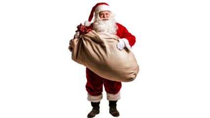A figurine of santa claus with a red suit and a bag of presents on a white or transparent background image view