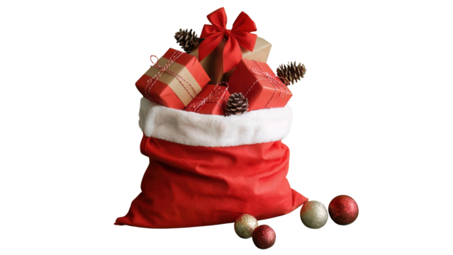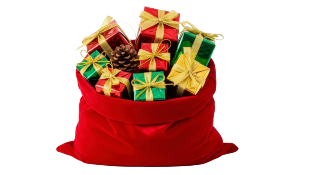Red santa claus sack overflowing with christmas presents isolated on transparent background