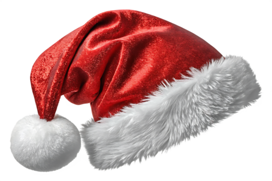 Classic santa hat with red velvet and white trim for festive holiday celebrations. Cut out PNG