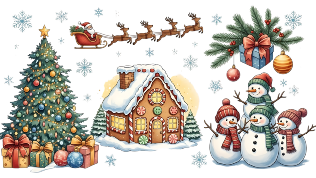 Christmas scene with Santa sleigh gingerbread house snowmen and tree santa claus