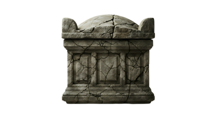 An ancient, cracked stone sarcophagus with decorative carvings, isolated on transparent background