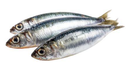 Fresh sardine fish with detailed scales and fins isolated on white transparent background, symbolizing canned seafood