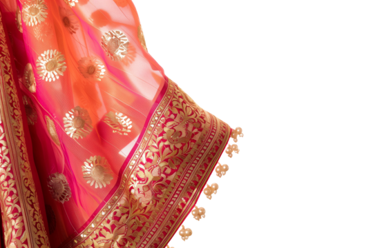 Traditional silk sarees draped elegantly, showcasing intricate designs and vibrant colors, perfect for festive occasions on transparent background