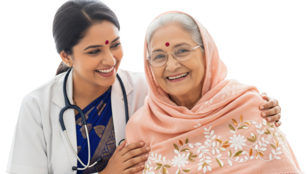 Smiling Indian female doctor warmly embracing a senior woman patient, symbolizing compassionate elderly healthcare and support.