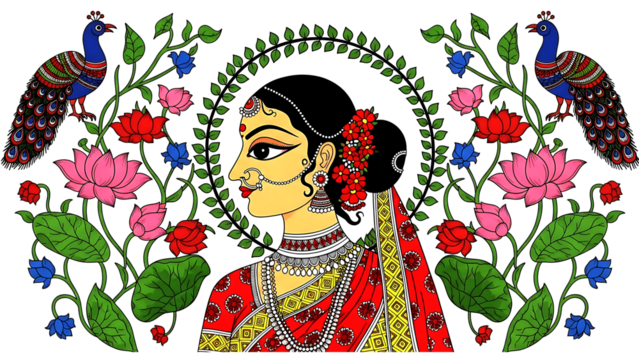 A beautiful portrait of a traditional indian woman adorned with jewelry and surrounded by peacocks and lotus flowers isolated on transparent background