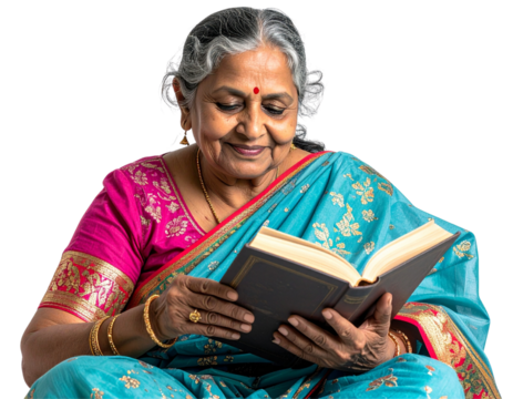 - Elderly Indian Woman in Saree Sitting Cross-Legged and Reading Book, Calm Expression, Isolated on Transparent Background