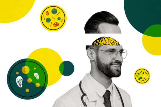 Composite photo collage of happy doctor cut head brain organ microbiology research covid illness discover isolated on painted background