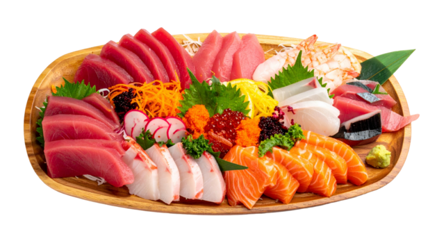 A platter of fresh sashimi with slices of tuna salmon and other premium seafood delicacies Isolated on transparent background PNG
