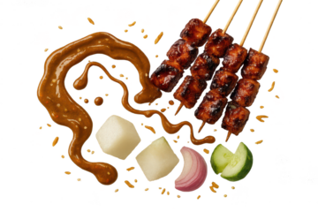 Thai chicken satay skewers with peanut sauce isolated on transparent white background