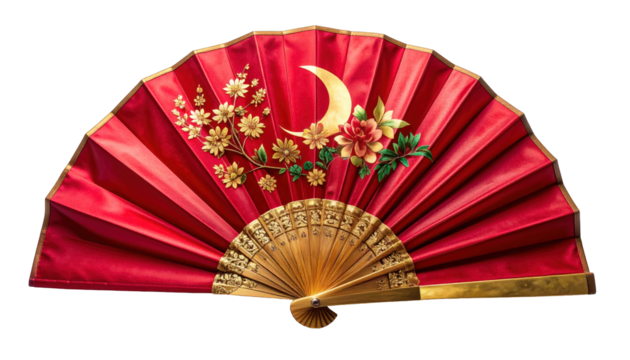 Crimson silk folding fan with gold floral and moon accents. Intricate design, elegant