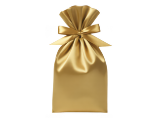 Elegant gold satin gift bag with ribbon tie isolated on transparent background