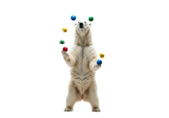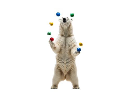 Majestic adult polar bear standing on powerful hind legs, skillfully juggling saturated glossy primary color balls on a transparent studio background concept of mastery and multitasking
